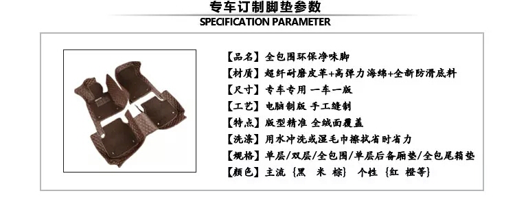 卖家承诺;一般地区包邮,偏远地区除外。此商品采用环保无味皮革,支持市面百分之九十九的车型定制。下单时请在留言处备注车型年份,如;卡罗拉2016款咖色。也可咨询客服。